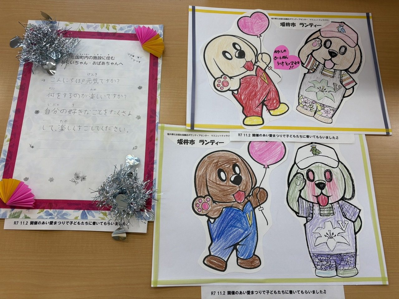 あい愛まつりでは塗り絵や三国町内の施設に住むおじいちゃん・おばあちゃん宛に手紙を書くブースも設置し、子どもたちに書いてもらいました。作品は、あい愛まつりに協力いただいた高齢者施設へ配布しました。