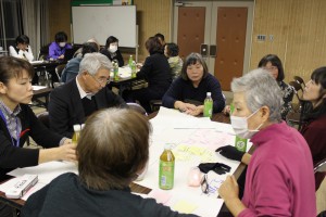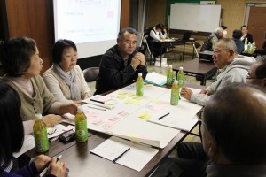 20名の参加者が4グループに分かれ、西部地区や自分の区のいいところ、自慢したいところ、気がかりなところ等を挙げたうえで、自分たちでできることや、良いところを伸ばし、気がかりなところを解決するために何が必要かなの意見を出し合いました。
